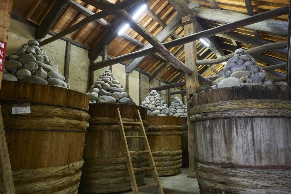 製造所内に流れるゆったりとした時間や香りの中で、歳月を重ねた味噌桶の存在感や天に向って積み上げられた重石の力強さなど、